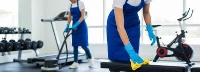 Two smiling cleaners, wearing blue aprons and gloves, performing home offices cleaning, one vacuuming while the other wipes a desk with a computer monitor.