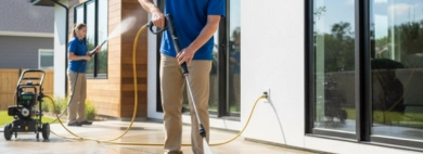 We use power washing on tough exterior surfaces to remove stubborn grime and weather stains effectively.